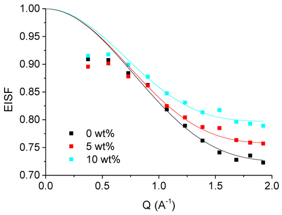 We determined first the EISF A0 (Q) for the three samples with no, 5 and 10 wt% sucrose (see Figure 5). According to the diffusion-in-a-sphere model and Equation (9), the value of the EISF at highest Q is representative for the proportion p of particles, e.g., H nuclei and molecular subgroups to which they are bound, seen as immobile within the instrumental time resolution. R is representative of the radius of the sphere delimiting the particles’ motions. Both quantities are progressively increasing with sucrose concentration (see Table 2), although the radius is mainly the same for all samples within error bars. Due to the increasing viscosity of the solution in the presence of sucrose, more particles are slowed down at higher sucrose concentration.