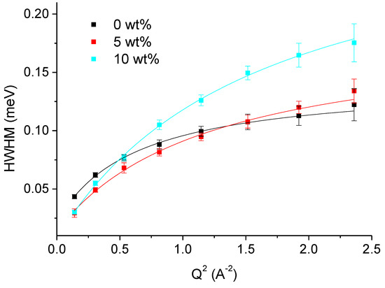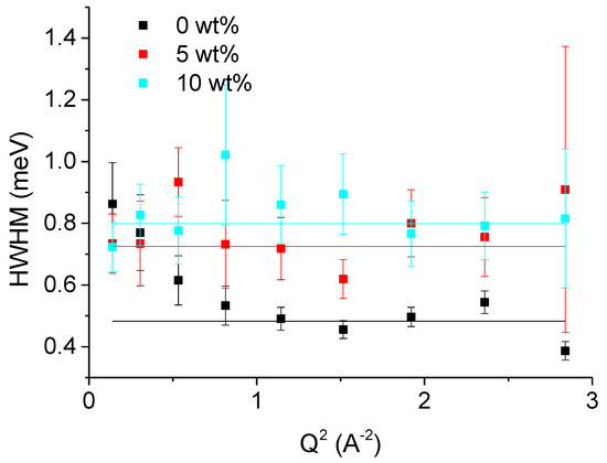 Figure 7 shows the HWHM of the broader Lorentzian curve, used to fit the QENS data. The obtained values are tainted with bigger error bars and do not show a systematic dependence on Q. These smaller molecular motions can be attributed to rotational diffusion, which does not depend on Q. The HWHM Γ is related to the rotational diffusion coefficient ΓR = 2DR (see Equation (7)). Here, the effect of sucrose has an opposite effect: an increase of the rotational diffusional coefficient from 0 to 10 wt% yielding the values for DR of (0.24 ± 0.02) meV, (0.36 ± 0.02) meV, and (0.4 ± 0.01) meV, respectively.