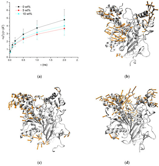 Mean square displacement values calculated for protein over MD trajectories with different time windows (τ) showed nonlinear patterns, as it was observed experimentally: a decrease in mobility at 5 wt% sucrose, compared to 0 wt%, and an increase at 10 wt% sucrose solution (Figure 8a). This effect becomes more pronounced with the increase of τ. The per-residue RMSF distribution is ambivalent, showing increased and decreased mobility of some areas in all systems (see ESI, Figure S4).