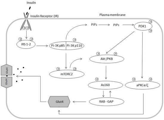 The pivotal action of insulin is to stimulate glucose uptake into cells by increasing the translocation of the glucose transporter 4 (GLUT4), from intracellular storage to the plasma membrane [29]. Insulin controls glucose uptake by acting on tyrosine kinase of insulin receptor. It is composed of two extracellular α subunits and two transmembrane β subunits combined together by disulfide bonds. Binding of insulin to the α subunit induces a conformational change resulting in the autophosphorylation of tyrosine residues present in the β subunit (Figure 1). Autophosphorylation of all tyrosine residues in the β subunit is needed for the full activation of the insulin receptor [30]. Receptor activation leads to phosphorylation of key tyrosine residues on signaling molecules, including Shc, Grb2 and insulin receptor substrates (IRS). IRS are scaffolding proteins and the two most predominant IRS involved in metabolic regulation in human skeletal muscles are IRS-1 and IRS-2 [31]. IRS 1-2 are phosphorylated on multiple tyrosine residues that form binding sites for intracellular molecules containing Src-homology 2 (SH2) domains, such as the p85 regulatory subunit of PI3 kinase (PI3-K), which is bound to the p110 catalytic subunit as a heterodimer [32]. The activity of PI3 kinase leads to the production of phosphatidylinositol bisphosphate (PIP2) and phosphatidylinositol triphosphate (PIP3). The PIP2 and PIP3 generation is necessary for full protein kinase B activation. Protein kinase B (PKB), also known as Akt (Akt/PKB), is phosphorylated at Thr308 in the catalytic domain by phosphinositide-dependent kinase-1 (PDK1) that interacts with the second messengers products PIP2 and PIP3. PDK1 directly phosphorylates and activates protein kinases C (PKC). PKC-ζ and α isoforms (PKC-ζ/α) are other signaling proteins involved in this process [33].