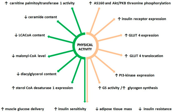 Figure 2. Effects of physical activity on lipid metabolism and insulin sensitivity. Orange arrows—impact of exercise on lipid metabolism; green arrows—impact of physical activity on glucose metabolism.