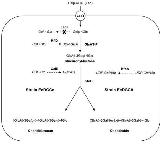 Briefly, genes lacZ and wcaJ were knocked-out, resulting in the incapacity of the strain to degrade lactose (Lac), or to produce colanic acid which is a GlcA-containing polysaccharide []. In addition, recombinant mammal β1,3-glucuronyltransferase GlcAT-P and UDP-Glc dehydrogenase KfiD were expressed, thus allowing the production of glucuronyllactose (GlcA-Lac) upon Lac implementation [,]. Genes kfiD and glcAT-P were both expressed in low copy pBBR, while the gene kfoC encoding chondroitin synthase was expressed in high copy pBluescript.