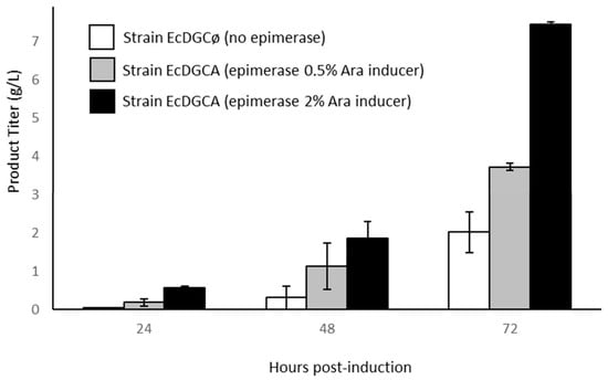 The strain “EcDGCA” was constructed in order to observe the incorporation of GalNAc while expressing UDP-GlcNAc 4-epimerase KfoA, providing UDP-GalNAc from UDP-GlcNAc epimerisation. Gene kfoA was cloned in medium copy pBAD33 carrying the tightly regulated promoter araBAD. Expression of the epimerase was induced by arabinose, independently of the other three recombinant genes induced by IPTG. It was thus possible to modulate the level of epimerase activity without changing the expression of the other recombinant genes. Strain EcDGCA was very similar to strain K-cho that we have described previously, capable of producing recombinant chondroitin from lactose and lactose-furyl [].