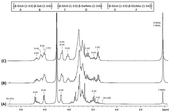 Figure 3. 1H NMR spectra of chondbiuronan (A) and chondroitin obtained using 0.5% (B) and 2% (C) arabinose induction. Inset: chemical structure of the polysaccharides.