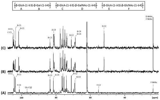 Figure 4. 13C NMR spectra of chondbiuronan (A) and chondroitin obtained using 0.5% (B) and 2% (C) arabinose induction. Inset: chemical structure of the polysaccharides.