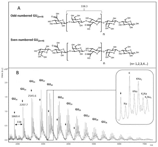 Figure 5. Possible structures of chondbiuronan depending on reducing termini (A) and negative-ion linear MALDI mass spectrum of compound 1 (B). Acidic [M-H]- peaks are denoted by arrows. Na/H and K/H exchanges are observed increasingly with molecular weight (enlarged peaks).