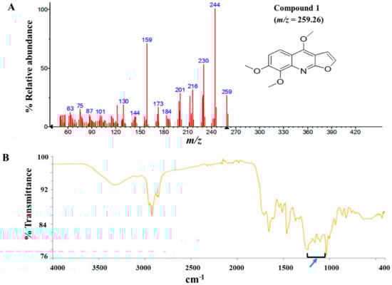 GC-MS and Attenuated Total Reflectance (ATR)-IR analysis of compound 1: Compound 1 was isolated from the dichloromethane fraction of Z. zanthoxyloides (root) and identified through gas chromatography-mass spectrometric (GC-MS) analysis. The mass fragmentation of compound 1 identified it as 4,7,8-trimethoxyfuro (2,3-b) quinoline with m/z = 259.26 (A). The aromatic nature of compound 1 was suggested by the absorbance at 1335–1250 cm−1 ((B), blue arrow).