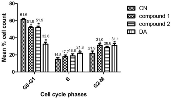 Effect of compounds on cell cycle of T. brucei. Error bars originate from mean percentage count ± standard error of the mean (Mean ± SEM) for three distinct experiments. Three cell cycle phases were analyzed: G0-G1, S and G2-M. Experiment was carried out at the EC50 values. DA = Diminazene aceturate; CN = Negative control (*: p-value < 0.05).