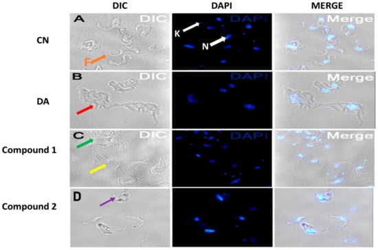 Effect of compounds on cell morphology of T. brucei. Cells were treated at the EC50 values of compounds. Red arrow (B) = aggregated DA-treated cells, green arrow (C) = aggregated compound 1-treated population, yellow arrow (C) = less distorted compound 1-treated population, purple arrow (D) = severely distorted compound 2-treated population, F (orange arrow, (A)) = flagellum, K (white arrow, (A)) = kinetoplast, N (white arrow, (A) = nucleus; DIC = differential interference contrast; DAPI = 4′, 6-diamidino-2-phenylindole; DA = diminazene aceturate; CN = negative control.