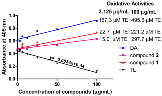 Measurement of reactive oxygen species is important in the investigation of oxidative damage in kinetoplastids. To investigate the oxidative potential of the compounds, their antioxidant properties in T. brucei were determined by employing the reducing properties of ABTS (2,2′-azino-bis (3-ethylbenzthiazoline-6-sulfonic acid). For an effective standard antioxidant, such as the water-soluble analog of vitamin E (Trolox), a dose-dependent reduction in absorbance of the ABTS radical at 405 nm is expected (Figure 6). Thus, the dose-dependent increase in absorbance for compound 1- and compound 2-treated cells is a strong indication of their oxidative rather than antioxidant potential (Figure 6). Compound 1 exhibited respective oxidative activities of 22.7 and 221.2 μM Trolox equivalent (TE) at the minimum (3.125 μg/mL) and maximum (100 μg/mL) tested concentrations of the compound, while compound 2 induced minimum and maximum oxidative activities of 15.0 and 297.7 μM TE, respectively, at the same tested concentrations (Figure 6). DA exhibited particularly high oxidative potentials of 167.3 and 495.6 μM TE at the minimum and maximum tested concentrations, respectively (Figure 6).