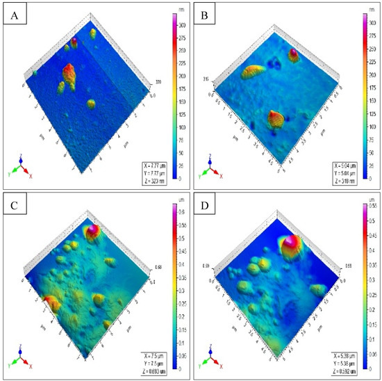 Atomic force microscopy images of HeLa cells: (A,B) untreated HeLa cells, (C,D) HeLa cells treated with conjugate 4 at 20 µg/mL.