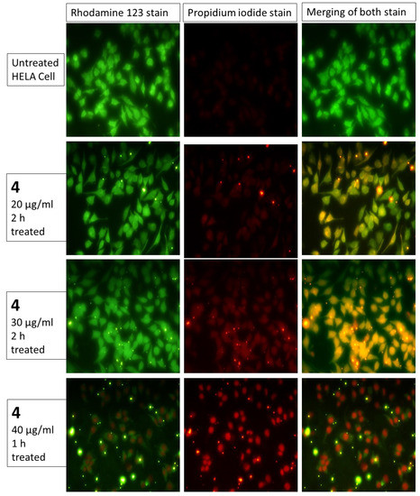 The next day, 1 mL of the fresh media with 2% FBS was made, in which rhodamine 123 and propidium iodide dyes were added to make final concentrations of 10 and 5 µg/mL, respectively. Compounds 4, 4a, and 4b at four different concentrations (10, 20, 30, and 40 µg/mL) were mixed with 1 mL of this media. Old media from the plates were aspirated from each well and 200 µL of fresh media containing compounds, rhodamine 123, and PI dye were added in their respective wells in triplicate and incubated at 37 °C in a 5% CO2 incubator. After 1 and 2 h incubation, media was aspirated from the wells and washed with PBS. These cells were visualized for rhodamine 123 and PI dye staining in a Nikon Eclipse TE2000-U fluorescence microscope at 200× magnification in FITC and TXR filters respectively. Images of cells at the same location for both dyes were captured. Rhodamine 123 and PI staining give green and red fluorescence, respectively. These two different colored images were then merged with one another using ImageJ software (NIH, Bethesda, MD, USA).