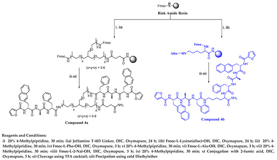 The Jeffamine-based linker was synthesized as reported in the literature, using Jeffamin T-403 as a starting material [31]. Two dendrimeric forms of conjugates (4a and 4b) were prepared by linking each pair of monomeric conjugate 4 to a shared Lys residue or Jeffamine linker at the C-terminal of the conjugate (Scheme 1). The antiproliferative effects of the Jeffamine-based dendrimeric conjugate 4a and the lysine-based dendrimeric conjugate 4b were evaluated against HeLa cells and they were found to be inactive (IC50 > 100 µg/mL). These results show that conjugate 4 requires the C-terminus free in the form of amide for its activity against HeLa cells.