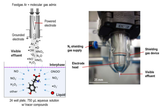 - Reuter, S.; von Woedtke, T.; Weltmann, K.D. The kINPen-a review on physics and chemistry of the atmospheric pressure plasma jet and its applications. J. Phys. D Appl. Phys. 2018, 51. [Google Scholar] [CrossRef]