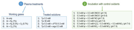 Buffered solutions (pH 7.4) of tyrosine 0.3 mM were incubated for 2 min at room temperature under constant mixing with equimolar amounts of control oxidants (300 µM). Those were (1) peroxynitrite (Merck KGaA, Darmstadt, Germany) at pH 14; (2) peroxynitrite at pH 6.4, yielding 30% peroxynitrous acid dissociation in nitric dioxide radicals and hydroxyl radicals [54,82,83]; (3) the nitric oxide donor DEA NONOate (Biomol GmbH, Hamburg, Germany); (4) nitrite and nitrate (Merck KGaA, Darmstadt, Germany); (5) hydrogen peroxide (Merck KGaA, Darmstadt, Germany); and (6) mixed solutions of nitrite, nitrate, and hydrogen peroxide. For solutions (5) and (6), 300 µM of each control oxidant was included. After reaction, samples were put on ice and immediately subjected to mass spectrometry analysis. An overview of all the plasma treatment conditions (working gases and treated solutions) and of the solutions incubated with control oxidants is shown in Figure 2.