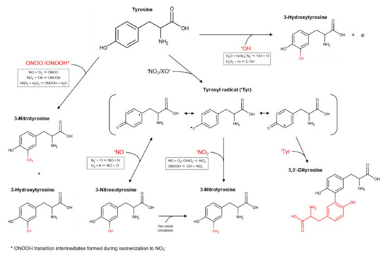 A non-radical mechanism driven by peroxynitrous acid and peroxynitrite has also been proposed by [88], leading to tyrosine hydroxylation and nitration by formation of ONOOH transition intermediates during the H+ driven isomerization of peroxynitrous acid to NO3− and H+. Indeed, the energy and the rate for the isomerization (18 kcal mol−1 and 1.3 s−1, respectively) are equivalent to those necessary to achieve the nitration or hydroxylation of aromatic compounds, occurring independently from their concentrations. At very low pH (<2.5), the formation of nitryl anion (NO2+) by peroxynitrous acid or peroxynitrite heterolysis could occur and lead to tyrosine nitration [89]. However, this mechanism can be excluded in our system, because of the controlled pH at 7.4.
