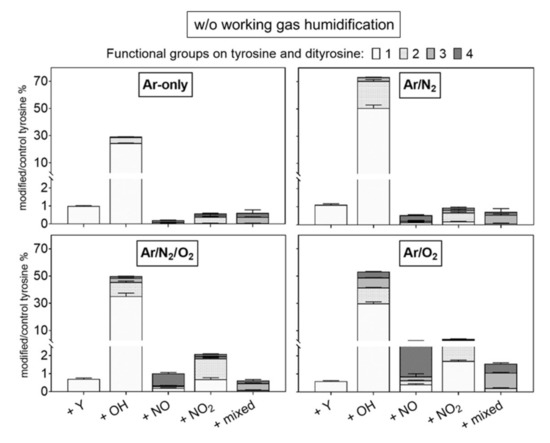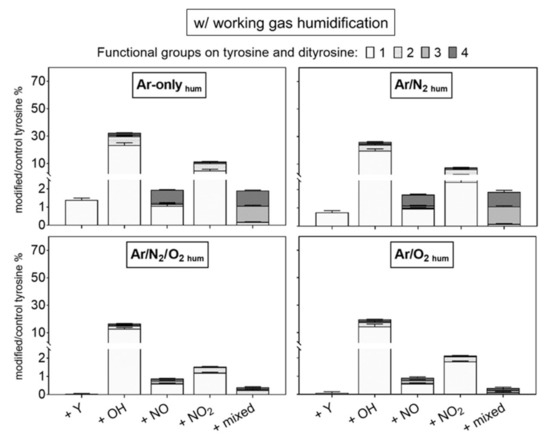 As shown in Figure 4 and Figure 6, the addition of humidity in the working gas reduced the general tyrosine oxidation in conditions containing oxygen, increasing drastically in Ar and Ar/N2 the production of nitrotyrosine (up to 2 µM), nitrosotyrosine (one and four −NO groups, 2%), mixed modifications (2%), and multiple nitration events (two −NO2 groups, 8%). Conditions with Ar-only in the working gas became slightly more oxidative (25% oxidized tyrosine) than dry conditions. In contrast, tyrosine oxidation was lower than in dry conditions with molecular admixtures (7% and 5% for Ar/O2 and Ar/N2/O2, respectively), as well as the production of tyrosine derivatives (Figure 6).