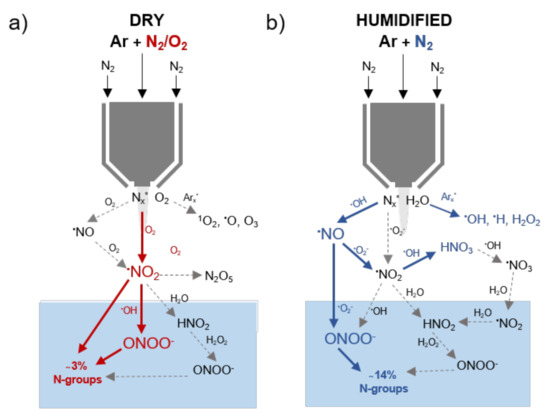 This can be explained by the interaction of water molecules in the effluent with gaseous species formed using Ar/O2 and Ar/N2/O2 (e.g., ˙O, 1O2, ˙NO2). In parallel, it was shown that this interaction, mostly with Ar2* and ˙O, generated ˙OH, ˙H, and ˙O2− in the effluent area, which partially diffuse into the target, forming high amounts of H2O2 by recombination of ˙OH [40,103]. In the gas phase of humidified kINPen plasmas with low O2%, a boost of gaseous nitrogen chemistry was also detected, with higher production of HNO3 (~4 × 1013 cm−3) and ˙NO (~6 × 1013 cm−3), rather than ˙NO2, the formation of which depended on O2% densities [41].