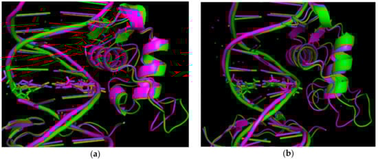 Molecular dynamics (MD) simulations have been previously used for exploring the DNA binding sites of various proteins (including transcription factors) exploiting three different approaches. In the first one, the focus is on the DNA and its behavior to reveal the recognition/binding motifs on the DNA [] and/or to improve the accuracy in the prediction of binding sites []. The second one focuses on the protein structure and how various mutations in proteins or their specific domains affect their ability to bind to the DNA [,,,]. The third approach focuses on studying the protein–DNA complexes to uncover types of interactions between them and the binding affinity of proteins towards DNA [,,,].
