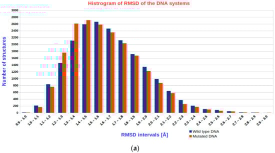 Histograms of root-mean-square difference (RMSD) of atomic positions throughout 16 independent 5 ns molecular dynamics simulation production runs of the four investigated systems: (a) The wild-type DNA chain containing the HNF-1α gene promotor sequence in blue, and the mutated DNA chain containing the HNF-1α gene promotor sequence with the rSNP rs35126805 in red color; (b) the complex of transcription factor HNF-4α bound to the wild-type DNA HNF-1α gene promotor sequence in blue color, and the complex of transcription factor HNF-4α bound to the mutated DNA HNF-1α gene promotor sequence with the rSNP rs35126805 in red color.