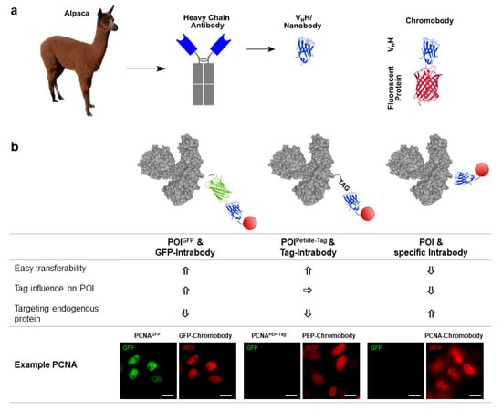 Intrabodies for visualization. (a) Schematic depiction of nano- and chromobodies derived from heavy-chain antibodies of Camelidae (b) Illustration of different labelling strategies for visualization of the protein of interest (POI) using intrabodies coupled to a detectable moiety and summary of their characteristics: POI genetically coupled to GFP recognized by a GFP intrabody, POI genetically coupled to a short peptide-tag recognized by the tag-specific intrabody and POI directly recognized by a specific intrabody. Model protein structures adapted from PDBs 3OGO, 5H88, 1EMA and 5LEW. Representative images of living Hela cells transiently expressing PNCAGFP and the GFP-specific chromobody (tagRFP), PNCAPEP-tag and the PEP-tag-specific chromobody (tagRFP) or PCNA-specific chromobody (tagRFP) as examples for the described labeling strategies are shown. Scale bar: 25 µm.
