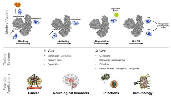 In contrast to light switchable systems, chemogenetic controllable systems bear the advantage of a stepwise regulation through precise titration of the active compound. Recently, such ligand-modulated binders have been generated by insertion of permutated bacterial dihydrofolate reductase (cpDHFR) in the CDR3 region of intrabodies. While the unstructured cpDHFR does not affect binding of the intrabody, addition of small compounds such as NADPH or trimethoprim changes the conformation of the cpDHFR, which results in the release of the bound antigen. This reversible process was nicely shown for several intrabodies inducing e.g., targeted antigen relocalization in living cells. It impressively demonstrates how intrabodies can be turned into switchable binders by the addition of small, non-toxic compounds []. Additionally, controlling protein function via switchable intrabodies in vivo is of great interest, thus providing the possibility of tunable phenotypes. This was successfully demonstrated by Deng et al., showing rapamycin-induced depletion of GFP-tagged CED-3 using the GFP-binding intrabody in combination with the E3 ubiquitin ligase, each fused to a rapamycin-responsive element. Following this strategy in a C. elegans model, the authors demonstrated how such an approach can be applied to influence e.g., induction of apoptosis in developing animals [].