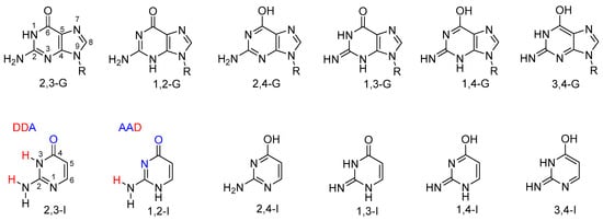In their seminal work, Watson and Crick emphasised the importance of the tautomerism of nucleic acid (NA) bases for DNA structures; only canonical tautomers of NA bases can form hydrogen-bonded complexes with their natural counterparts []. A tautomeric change modifies the hydrogen-bonding pattern of the nucleobase (a hydrogen-bond acceptor to a hydrogen-bond donor, and vice versa). Tautomeric modifications of DNA bases are, therefore, undesirable, as they can lead to errors in replication and transcription [,,,]. On the other hand, modifications of tautomeric forms have been speculated to play an important role in the catalysis and binding by RNA enzymes and aptamers []. For example, minor tautomeric and/or ionised forms of guanine have been proposed in the catalytic site of self-cleaving ribozymes [].