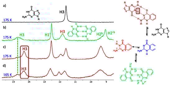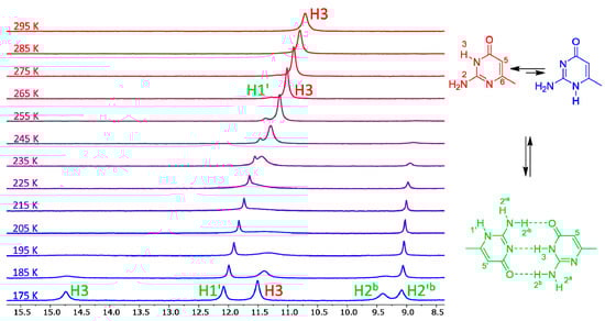 The low-field regions of variable-temperature 1H-NMR spectra of compound 7 in a 3:1 mixture of dimethylformamide (DMF)-d7 and CD2Cl2. Signals of imino hydrogens H1′ and H3, together with signals of amino hydrogens involved in intermolecular hydrogen bonds, appear in this spectral region. Another spectral region is shown in the SI (Figure S1).