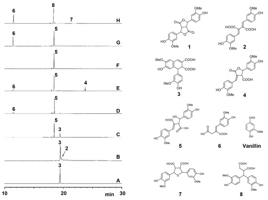 Left: Total ion chromatograms of crude products obtained from transformation of FA dilactone by 12-h alkali treatments: (A) 4 eq. 0.1M NaOH; (B) 15 eq. 0.1M NaOH; (C) 15 eq. 0.5 M NaOH; and (D–H) 120 eq. NaOH (D) 1.0 M; (E) 2.0 M; (F) 4.0 M; (G) 8.0 M; and (H) 16.0 M). Right: The structures of compounds 1–8 described in this work.