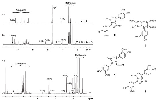 In situ 1H NMR (in D2O) of products from ferulic acid (FA) dilactone treated by (A) 1 M Na2CO3 and (B) 1 M NaOH. (C) 1H NMR (in Acetone-d6) of crude products recovered from 2 M NaOH treatment of FA dilactone.