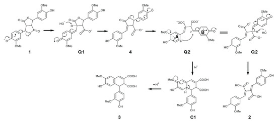 As for how these products were formed from FA dilactone under aqueous alkali treatment conditions, a plausible mechanism or pathways were proposed and illustrated in Figure 4 and Figure 5. In Na2CO3, NH4OH, or diluted NaOH solution, the FA dilactone was converted into quinomethide Q1 that loses a proton from 8-position readily to produce lactone 4, from which quinomethide Q2 was produced through opening the lactone by electron pushing. Two possible options for stabling Q2. One is a nucleophilic attack from carbon-A6 to the 7-position of B-ring to form compound 3 eventually through aromatization of intermediate C1. The other is an elimination of a proton from the 8-position producing compound 2 (Figure 4).