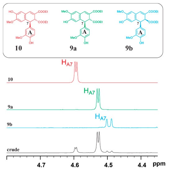 Partial 1H NMR spectra showing the characteristic chemical shifts of A-7 protons in crude products from acid catalyzed transformation of FA dilactone and compounds 9 and 10.