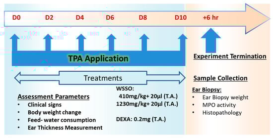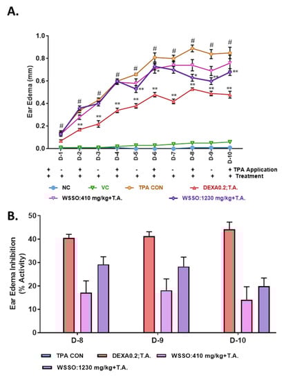 The TPA-induced mouse ear skin inflammation model, as described previously, was employed with minor modifications [,]. Briefly, 20 μL of TPA solution (125 μg/mL in acetone) was applied topically on the mice ear on days 0, 2, 4, 6, 8, and 10. For vehicle control, the ear was treated with 20 μL of acetone alone on the same days. Ear thickness was measured every day using a digital vernier caliper (Mitutoyo, Tokyo, Japan). Increase in ear thickness was determined by subtracting the ear thickness of day 0 (before TPA or acetone application) from the respective time point thickness. Anti-psoriatic activity of WSSO was investigated on animals stimulated with TPA. Treatment regime was followed as described for other ayurvedic oil based formulations for skin disorders, where topical application on affected skin was complemented with an oral dose supplement [,,]. Animals were treated with 20 μL topical application WSSO along with 410 or 1230 mg/kg p.o. or with DEXA at 0.2 mg/ear (topically) throughout the experiment, as indicated in Figure 1. WSSO animal oral doses were calculated following Jacob and Nair’s method [], based on estimated human daily dose of 2 to 6 g/day, for other comparable oil based formulations []. The anti-psoriasis activity (%) was calculated for each animal on day 10 (D10), using the following formula: