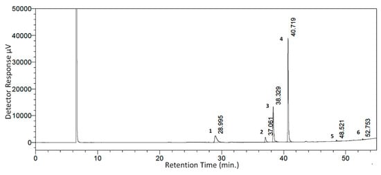 A total 1800 g of WS seed powder was subjected to the supercritical CO2 extraction procedure. After optimizing extraction protocol, 234.0 g of oily material (WSSO) was obtained as the final yield. The percentage extracted yield was calculated as ~13%. For GC-FID analysis, WSSO was mixed with different solvents to obtain fatty acid methyl esters (FAME). The FAME from WSSO was isolated and investigated using GC-FID. The detailed analysis of WSSO confirmed presence of four major peaks and couple of minor peaks (Figure 2). Different fatty acids were identified and quantified by peak analysis with respect to reference standards (Table 1). These fatty acid components were identified and individually quantified as following: linoleic acid (54.15%), oleic acid (23.16%), palmitic acids (12.64%), stearic acid (4.07%), 11,14,17-eicosatrienoic acid (0.66%), and nervonic acid (0.38%). A few unidentified fatty acid components were also present in the WSSO and found to be below the limit of quantification of the GC-FID detector (Table 1).
