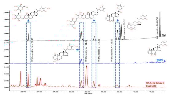 Stacked-up HPLC profiles of WSSO and the post-supercritical fluid extraction (SCFE) exhaust of WS seeds, with known standards: Withanolides contents were identified using standards mix (black line). Post-SCFE exhaust of Withania somnifera Dunal (WS) seeds (red line) showed good presence of withanoside IV, withaferine A, withanoside V, and withanolide A, at standard retention times (Rt). WSSO (blue line) chromatogram show identifiable peaks of withferine A (at Rt, 31.86 min) and of withanolide A (at Rt, 38.65 min). Most of the withanolides tested were identified in WS seed exhaust only. However, withanolide B and withanone were not decteced (ND) in any of the test samples. Relevent structures of withanolides are displayed at their identfied peak, as per standard mix. The observed concentrations of withanolides have been listed as % w/w with their respective retention time (Rt) in both test samples.