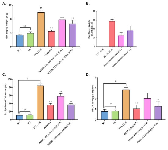3.3.3. WSSO Reduces MPO Activity in Ear Biopsy Tissue