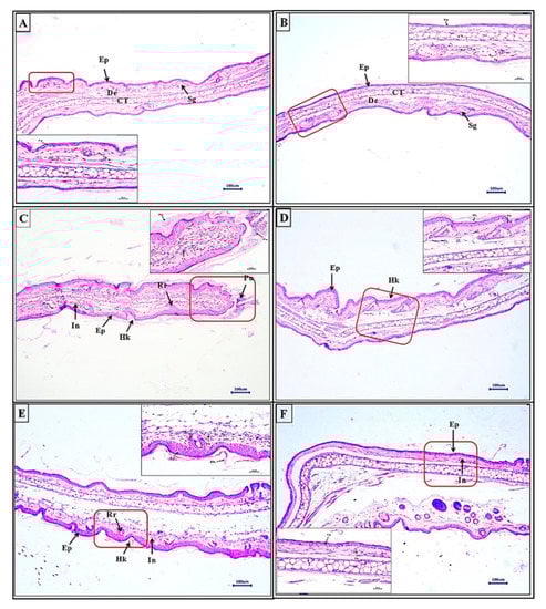 Histopathological analysis of ear biopsies revealed detailed structural changes after stimulation with TPA, causing hyperkeratosis, hyperplastic epidermis, pustule and rete ridge formation. Infiltration of the inflammatory cells was also observed in the dermal region (Figure 6C). In NC animals, skin was normal (Figure 6A), and similarly, no changes were observed in vehicle control (VC) animals (Figure 6B). DEXA treatment to TPA-induced psoriatic skin reduced the number of inflammatory cells and pustule formations (Figure 6D), with almost unchanged hyperkeratosis and hyper-plasticity in the epidermis. Surprisingly, the concurrent oral and topical application of WSSO on the psoriatic mice ear reduced signs of hyperkeratosis and hyper-plasticity (unlike DEXA) in the skin epidermis; however, inflammatory cells were still found in the dermal region (Figure 6E,F).