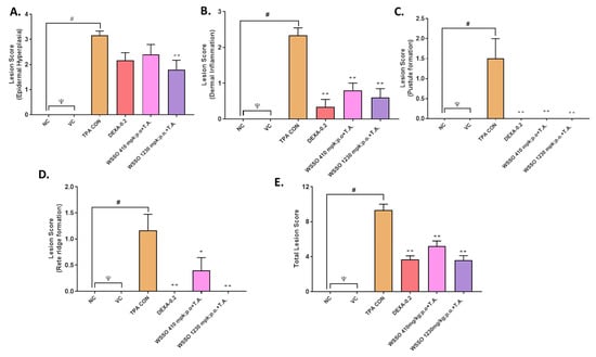 WSSO reduces the TPA-induced psoriatic histopathological score: TPA-induced inflammatory lesions were reduced by treatment with WSSO or DEXA. (A) Lesion score of epidermal hyperplasia reduced significantly by 1230 mg/kg WSSO treatment (p < 0.005). (B) Dermal inflammation reduced significantly post-treatment with WSSO (p < 0.001) at different doses in comparison to TPA CON. (C) Pustule formation score at epidermis reduced drastically with high significance after WSSO (p < 0.001) and DEX (p < 0.001) treatment compared to TPA CON; (D) Rete ridge formation was also inhibited, more significantly at 1230 mg/kg (p < 0.001) compared to 410 mg/kg (p < 0.05) of WSSO. Both of the WSSO treatments were supplemented with topical application (T.A.) of 20 µL of WSSO. (E) Total lesion score was calculated and significant reduction was observed after treatment with WSSO 410 and 1230 mg/kg (p < 0.001) and DEXA (p < 0.001) compared to TPA control. Values are presented as mean ± SEM, n = 6 samples in each group, ψ = non-significant (NC vs. VC), # p < 0.001 (NC vs. TPA), * p < 0.01, ** p < 0.001 (treated vs. TPA CON).