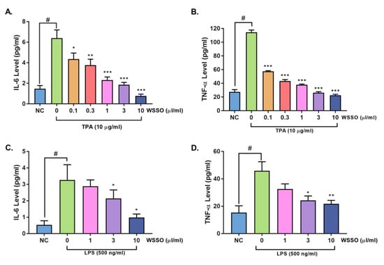 After pretreatment with different concentrations of WSSO, TPA- or LPS-induced secretion of cytokine expression was measured by ELISA. WSSO inhibited the stimulated release of IL-6 (Figure 8A,C) and TNF-α (Figure 8B,D) in a concentration-dependent manner. Significant (p < 0.001) up-regulation in the expression of IL-6 (6.3 ± 0.8 pg/mL) and TNF-α (114.4 ± 3.3 pg/mL) by TPA was observed, as compared to non-treated (NC) A431 cells (1.4 ± 0.3 and 27.4 ± 3.4 pg/mL for IL-6 and TNF-α, respectively). In TPA-stimulated A431 cells, treatment with WSSO (1 and 3 μL/mL), significantly reduced IL-6 release (Figure 8A) to 2.3 ± 0.3 and 1.8 ± 0.2 pg/mL (p < 0.0001). Similarly, expression of TNF-α (Figure 8B) after TPA stimulation was significantly (p < 0.0001) inhibited in all the WSSO treatments tested (0.1, 0.3, 1, 3, 10 μL/mL). Similarly, post LPS stimulation in A431 cells, concentration-dependent inhibition of IL-6 (Figure 8C), and TNF-α (Figure 8D) expression by WSSO was measured. Inhibition of IL-6 expression was significant (p < 0.05) at WSSO doses of 3–10 μL/mL (Figure 8C). WSSO also inhibited LPS-induced TNF-α expression at 3 and 10 μL/mL significantly (Figure 8D).
