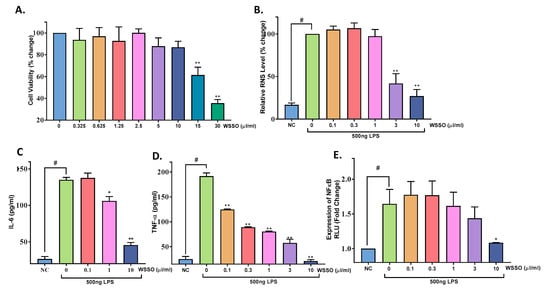 LPS-stimulated RAW264.7 cells exhibited highly significant upregulation in total reactive nitrogen species (RNS) production (p < 0.0001) (Figure 9B). RAW264.7 cells pretreated with WSSO had a significant reduction (p < 0.0001) in RNS compared to LPS stimulated cells at 3–10 μL/mL concentration (Figure 9B). Total RNS in control conditions (LPS alone) was taken as 100% and percentage change in RNS was calculated.