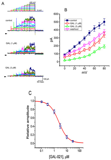 In an initial stage of electrophysiological recordings, we performed the whole cell configuration of patch-clamp experiments, in order to assess any possible perturbations of GAL-021 on IK(Ca) amplitude identified in these cells. The voltage-clamp current recordings were conducted in cells bathed in HEPES-buffered normal Tyrode’s solution into which 1.8 mM CaCl2 was put, and the recording pipette was filled with K+-containing solution which contained 140 mM K+, 0.1 mM EGTA, and 3 mM ATP. As whole-cell model, that is, when membrane patch was broken by suction, was achieved, we maintained the examined cell at the level of 0 mV, a level which was delivered to inactivate other types of outwardly rectifying K+ currents [36], and ionic currents were then evoked by a series of voltage pulses ranging between 0 and +80 mV. This type of macroscopic outward currents with a markedly noisy and outwardly rectifying property has been regarded as IK(Ca) which is particularly subject to inhibition by tremorgenic mycotoxins (e.g., paxilline or verroculogen) [16,35,37]. As illustrated in Figure 1A,B, the presence of GAL-021 (1 or 3 μM) produced a progressive decrease in IK(Ca) amplitude measured at the entire voltage-clamp steps. For example, at the level of +60 mV, the presence of 3 μM GAL-021 was able to decrease IK(Ca) amplitude from 418 ± 36 to 124 ± 13 pA (n = 8 and p < 0.05). After washout of the compound, current amplitude returned to 372 ± 24 pA (n = 7 p < 0.05). Similarly, as the cells were exposed to GAL-021 (3 μM), the whole-cell (i.e., macroscopic) conductance of IK(Ca) measured at the voltages ranging between +40 and +80 mV was significantly decreased to 3.41 ± 0.12 nS from a control value of 5.03 ± 0.18 nS (n = 7 and p < 0.05).