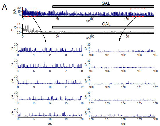 Because IK(Ca) is a large and noisy, K+ current which is sensitive to intracellular Ca2+ and membrane depolarization, and it results predominantly from the opening of BKCa channels that have been previously described [36,40]. Therefore, to determine whether the inhibitory effect of GAL-021 on IK(Ca) is linked to the perturbations on the unitary amplitude, the channel open-state probability, or both, the activity of BKCa channels present in these cells was measured and analyzed. As shown in Figure 3, under high-K+ conditions, the activity of BKCa channels can be readily observed in an excised inside-out patch. When the detached patch was exposed to GAL-021, the activity of channel openings was progressively decreased (Figure 3). The open-state probability of the channel measured at the level of +60 mV under control condition (i.e., in the absence of GAL-021) was found to be 0.182 ± 0.012 (n = 8). We found out that the addition of GAL-021 (10 μM) to the bath medium decreased the channel activity to 0.022 ± 0.002 (n = 8 and p < 0.01). However, there was no significant difference in the amplitude of the unitary outward current between the absence and presence of GAL-021 (11.4 ± 0.9 pA in the control versus 11.2 ± 0.8 pA in the presence of GAL-021, n = 8 and p > 0.05). Further addition of cilostazol (10 μM), still in the presence of GAL-021 (10 μM), was effective at reversing GAL-021-mediated suppression of BKCa-channel activity, while that of 9-phenanthrol (10 μM) had minimal effects on it. Cilostazol or 9-phenanthrol have been known to stimulate the activity of BKCa channels or intermediate-conductance Ca2+-activated K+ (IKCa) channels, respectively [40,41,42]. Therefore, it is apparent that the presence of GAL-021 can decrease the opening probability of BKCa channels in these cells, but not that of IKCa channels.