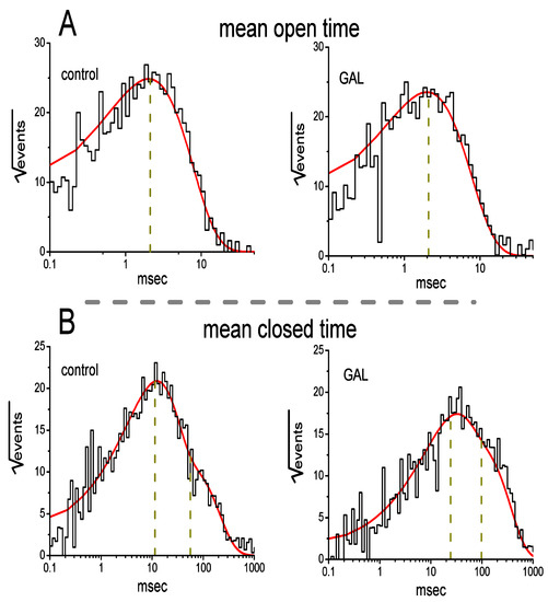 We further analyzed the effect of GAL-021 on the gating kinetics of these channels because of its inability to modify single-channel amplitude. In excised patches of control cells, open- or closed-time histograms at the level of +60 mV can be fitted with the goodness of fits by a one or two-exponential curve, respectively (Figure 4). The time constant for the open-time histogram was estimated to be 2.12 ± 0.11 msec, whereas those for the fast and slow components of the closed-time histogram were 11.4 ± 0.8 and 56.3 ± 2.1 msec, respectively (n = 7). The BKCa channels identified could exist in at least two resting or closed states. Notably, in detached patches, the addition of GAL-021 (3 μM) to the bath did not result in any modification on mean open time of the channel (2.09 ± 0.11 msec, n = 7 and p > 0.05), while it did increase the mean closed time to 24.3 ± 1.9 and 98.2 ± 2.5 ms (n = 7 and p < 0.05). Therefore, these results showed that this compound produced a conceivable increase in channel closed time. Such changes can help to account for its blocking effect on BKCa channels observed in GH3 cells.