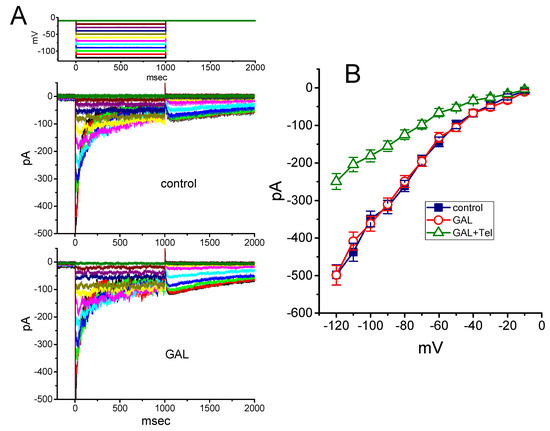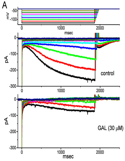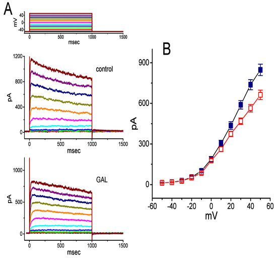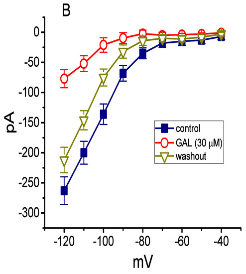 We further examined whether GAL-021 can perturb another type of K+ currents, namely IK(DR), enriched in these cells [36]. In these experiments, we bathed cells in Ca2+-free, Tyrode’s solution containing 1 μM tetrododoxin and 0.5 mM CdCl2. Tetrododoxin or CdCl2 was used to block voltage-gated Na+ or Ca2+ currents, respectively. Within 2 min of exposing cells to 10 μM GAL-021, the IK(DR) amplitude was mildly suppressed (Figure 7). For example, as the examined cells were depolarized from −50 to +50 mV, the addition of GAL-021 at a concentration of 10 μM decreased IK(DR) amplitude by 22 ± 3% from 847 ± 42 to 663 ± 35 pA (n = 7, and p < 0.05). Thus, these findings reflect that the presence of GAL-021 mildly suppresses the amplitude of IK(DR) in GH3 cells. However, previous studies have demonstrated that the IK(DR) present in GH3 cells could be mediated by several different subtypes of Kv channels, namely Kv1.2, Kv1.4, Kv1.5, Kv2.1, Kv2.2, Kv3.2, Kv4.1, and Kv5.1 [48]. To what extent the GAL-021 action on IK(DR) is specific for a unique subset of delayed-rectifier K+ channels still remains to be studied further.