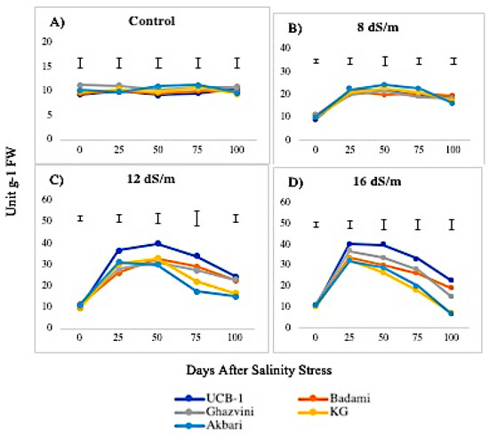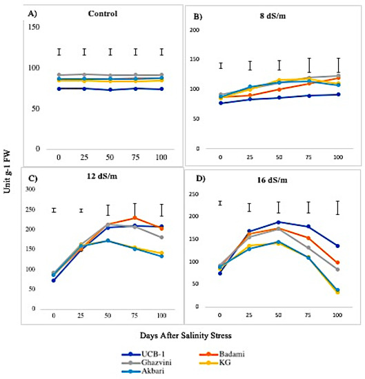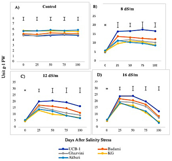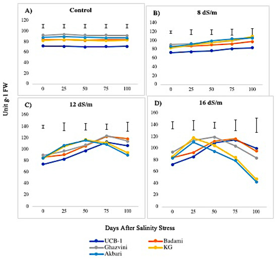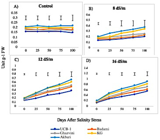 The activity of APX was higher in leaves than in roots, both in controls and in saline conditions. The APX activity in the leaves under the control condition was in the following decreasing order: Ghazvini followed by UCB-1, Badami, Akbari, and KG, remaining relatively unchanged over 100 days, and then significantly increased due to salinity (Figure 7). At 8 dS/m, 12 dS/m, and 16 dS/m NaCl treatments, all leaf tissues in cultivars showed a significant increase in APX activity up to 50 days and later declined gradually, with UCB-1 being the highest, followed by Badami, Gahzvini, KG, and Akbari. In root tissues, APX exhibited a significant increase due to salinity at 8 dS/m, 12 dS/m, and 16 dS/m in all the cultivars except in KG and Akbari. At 16 dS/m, UCB-1 was the highest, followed by Badami, Ghazvini, KG, and Akbari (Figure 8).