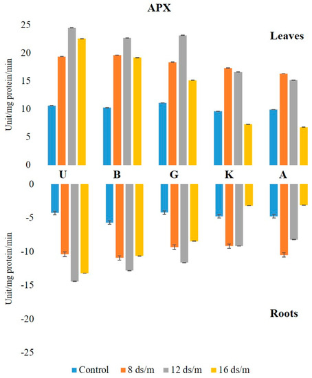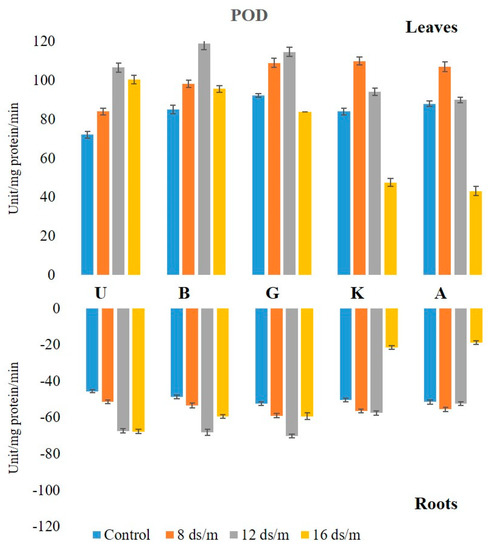 One of the enzymes, SOD, plays a major role in ROS scavenging in plants and is considered as the first line of defense against the toxic effects of elevated ROS levels [21,22]. SOD catalyzes the dismutation of superoxide radicals to H2O2 and O2. The increase of SOD activity might be the reason for enhanced O2 generation, as a result of electron leakage from the electron transport chains to molecular oxygen [23]. Similarly, POD activity was significantly altered in both tissues after salt treatments. POD levels were higher in control leaf tissues than in root tissues, produced by POD, CAT, APX, and other antioxidant enzymes. SOD levels were higher in control leaf tissues as compared with root tissues, and SOD levels were significantly higher in both leaf and root tissues due to salinity treatments. No significant difference was observed between the control and 8 dSm−1 in the leaf tissue, but a significant difference was observed in the root tissues at a low salt concentration (8 dSm−1) and also at increasing salinity levels of 12 dSm−1 and 16 dSm−1.