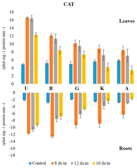CAT plays an important role in the antioxidant system. Both POD and CAT constitute a main H2O2 scavenging system in the cells [29]. The present data showed that CAT activity was higher in the leaves than in the roots under both saline and control conditions, however, the rate of increase in enzyme activity to salt stress is relatively high in roots (three to four times) as compared with leaf tissues among all the rootstock. Compared to the controls, the activity of CAT in the roots increased more than that in the leaves. Although the control CAT activity in leaf and root was relatively higher in Akbari as compared with UCB-1, at 16 dS/m, UCB-1 showed the highest CAT activity, whereas the Akbari performed the lowest among all the rootstock. CAT is involved in salinity stress and increases the resistance of plants to saline conditions [19,30]. CAT activity significantly increased in response to salinity.