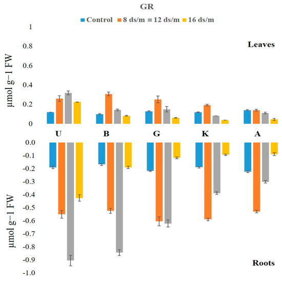 Glutathione reductase (GR) activity exhibited significant changes in leaf and root tissues (Figure 9). The GR activity was relatively low in leaves as compared with roots, under control conditions in the following decreasing order: Akbari followed by Ghazvini, UCB-1, KG, and Badami. At low concentrations of salt (8 dS/m) the GR levels elevated in all cultivars in both tissues. At moderate and high salt stress (12 dS/m and 16 dS/m), the GR activity in leaves showed mixed responses among the cultivars (Figure 10). For example, UCB-1 showed a linear increase in GR level at NaCl 12 dS/m and reduced at 16 dS/m in leaf tissue, while all other rootstock showed a gradual decrease in GR activity in both tissues. Under the 16 dS/m saline treatment, the maximum increase in the amount of GR activity was observed in the UCB-1 cultivar (1.9-fold in leaves and 2.2-fold in roots), followed by rootstock Badami, Ghazvini, KG, and Akbari in decreasing order.