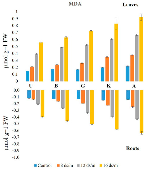 Lipid peroxidation levels, measured from MDA concentration, were higher in leaves than in roots under control conditions (Figure 11). The MDA levels increased linearly from low to high levels of NaCl in all rootstock, generally being higher in leaf as compared to root tissues. In leaf tissue, the level of MDA measured after 100 days of treatment with NaCl 16 dS/m was the highest in Akbari in both tissues (4.1-fold in leaves and 4.5-fold in roots) followed by KG, Ghazvini, Badami, and UCB-1 (Figure 12). A similar trend of MDA activity was observed in roots to NaCl treatments 8, 12, and 16 dS/m, with the maximum being recorded in rootstock Akbari followed by KG, Ghazvini, Badami, and UCB-1 (Figure 11).