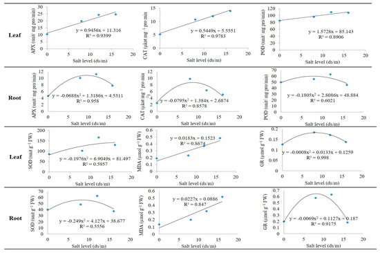 The linear and quadratic regression models for the enzyme activities of pistachio rootstock, in both leaves and roots, were evaluated. The enzymes APX, CAT, POD, and MDA had a linear regression model in leaves while the enzymes SOD and GR had a quadratic regression model with the salinity levels (Figure 13). In this study, nine of the 12 models had a high R-square. The three leaf enzymes, namely APX, CAT, and POD, had a linear regression model, but a quadratic regression model in roots. Among these models, CAT in leaves had the highest R-square (97%). Therefore, by increasing the salinity level, the concentration of the APX, CAT, and POD, enzymes in the leaves, as well as MDA in both leaves and roots, increased. The SOD and GR enzymes had quadratic regression models in both roots and leaves. In all of the models, GR in leaves had the highest R-square and explained more than 99% of the variance of the data, whereas the model of SOD in root only explained about 55% of the variation. The MDA had a linear regression model with a high coefficient of determination in both leaves and roots.